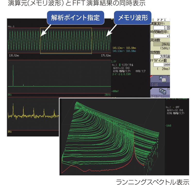 周波数成分の解析などを行う1信号FFT、伝達関数などの解析を行う2信号FFT