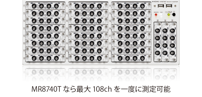 MR6000 の場合は最大 32 ch、MR8740T の場合は最大 108 ch を一度に測定で行きます。4 ch 入力かつ 100 mV f.s. の高感度レンジを備えているため、各種センサ出力の多チャネル測定が可能です。自動車の電装制御系開発の大小様々な電流測定に有効です。マルチレンジの電流プローブ CT6711 との組み合わせで、1 mA から 50 A の電流測定に対応します。