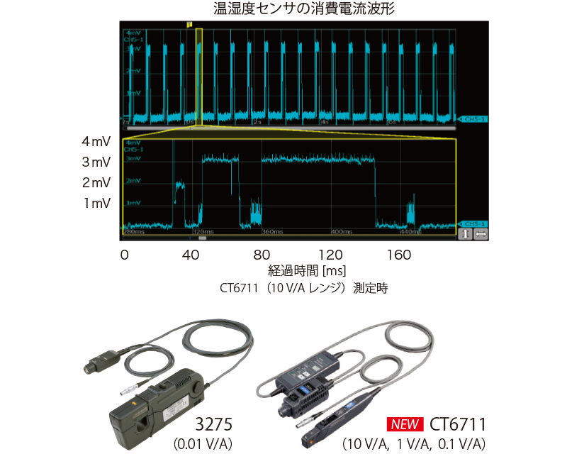 低消費電力デバイスの微小電流波形を 100 μA の分解能で解析できます。デバイスの消費電流波形を高分解能・長時間記録できます。