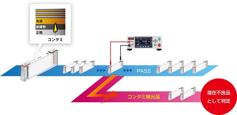 ばらつきのない安定した絶縁抵抗試験や、コンタミによる内部短絡を検出できる検査品質を実現しています。