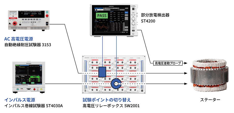 部分放電検出器ST4200は、高電圧リレーボックスSW2001と組み合わせることで、モーター生産試験向けの包括的な部分放電(PD)検出とシームレスなシステム統合を実現します。ST4200の高周波CTによるPD検出は、PD検出にマイクロ波アンテナを使用する場合に問題となる、生産ラインでのノイズ干渉を軽減します。