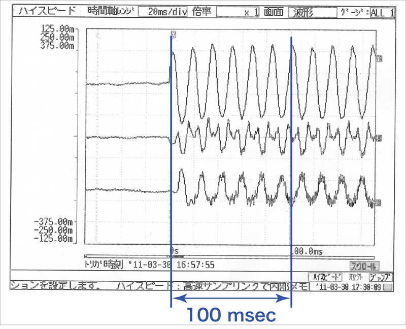 オシロスコープやメモリハイコーダに接続して、磁界の波形を観測できます。出力レートは0.1 mV/表示値(磁束密度単位Tを基準)