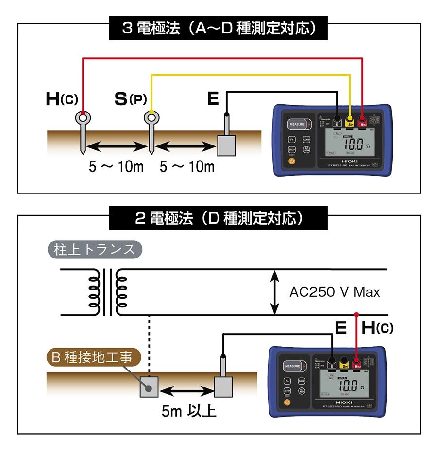 測定方式 | 2 電極法 (D 種測定対応) / 3 電極法 (A〜D 種測定対応) | |||||