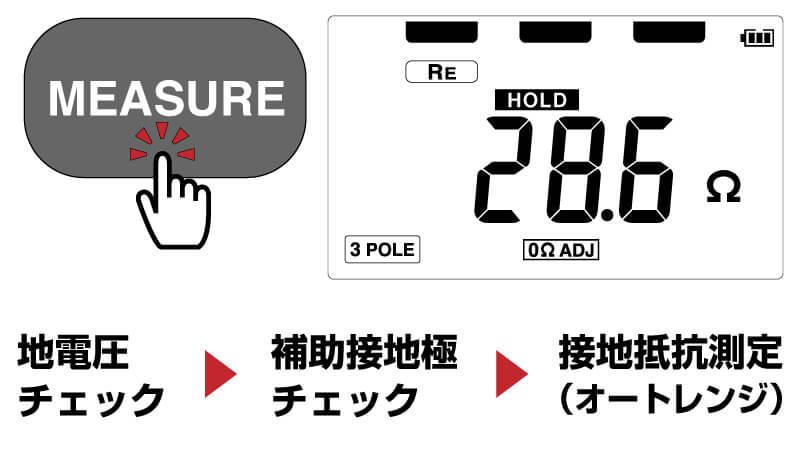 地電圧チェック→補助接地極チェック→接地抵抗測定の各項目を自動で行います。