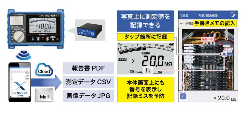 専用無償アプリGENNECT Cross では、測定結果の確認、管理、レポート作成が可能です。測定現場の写真を撮影し、写真上に測定結果を転送入力、手書きでメモを書き込むなど、現場でスムーズにデータを管理できます。