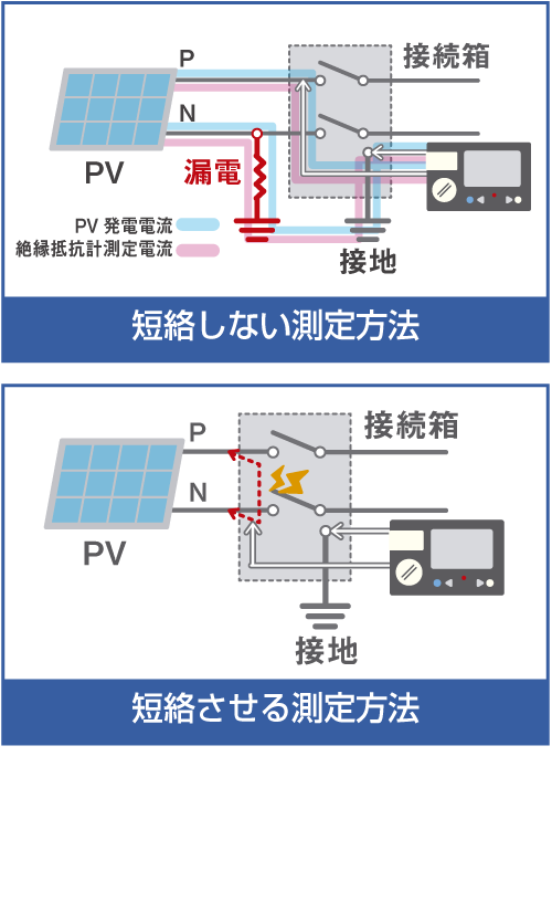一般社団法人 日本電機工業会様(JEMA)及び一般社団法人 太陽光発電協会様(JPEA)で共同作成された「太陽光発電システム保守点検ガイドライン」によって規定されている2つの測定方法と従来絶縁抵抗計の問題点