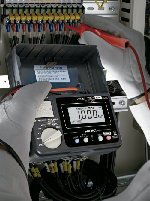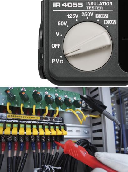 PVΩ レンジを持つ 絶縁抵抗計 IR4055 は 短絡しなくても正確、安全に測定できます