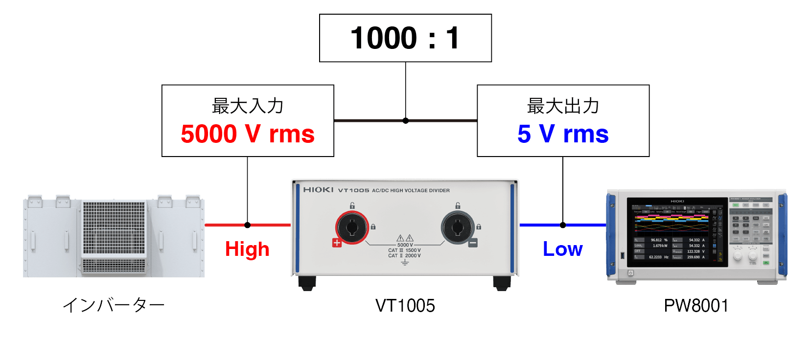 一般的にパワーアナライザ単体では、1000 V (AC) 以上の電圧をダイレクトに測定できません。VT1005を使用すると、最大5000 Vの大電力をパワーアナライザで正確に測定できます。