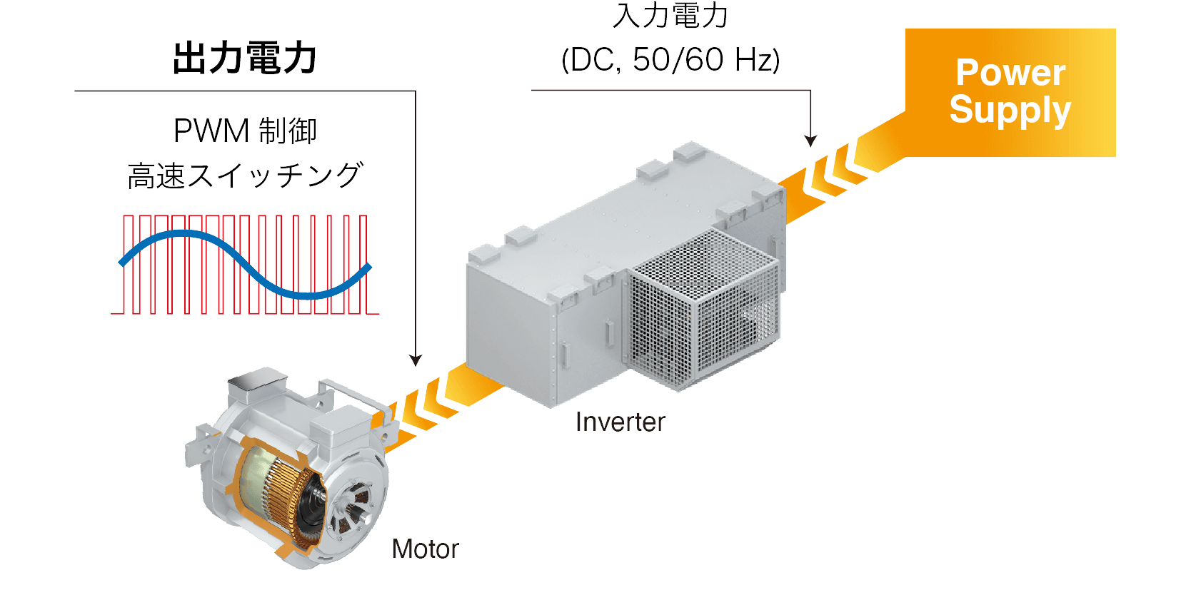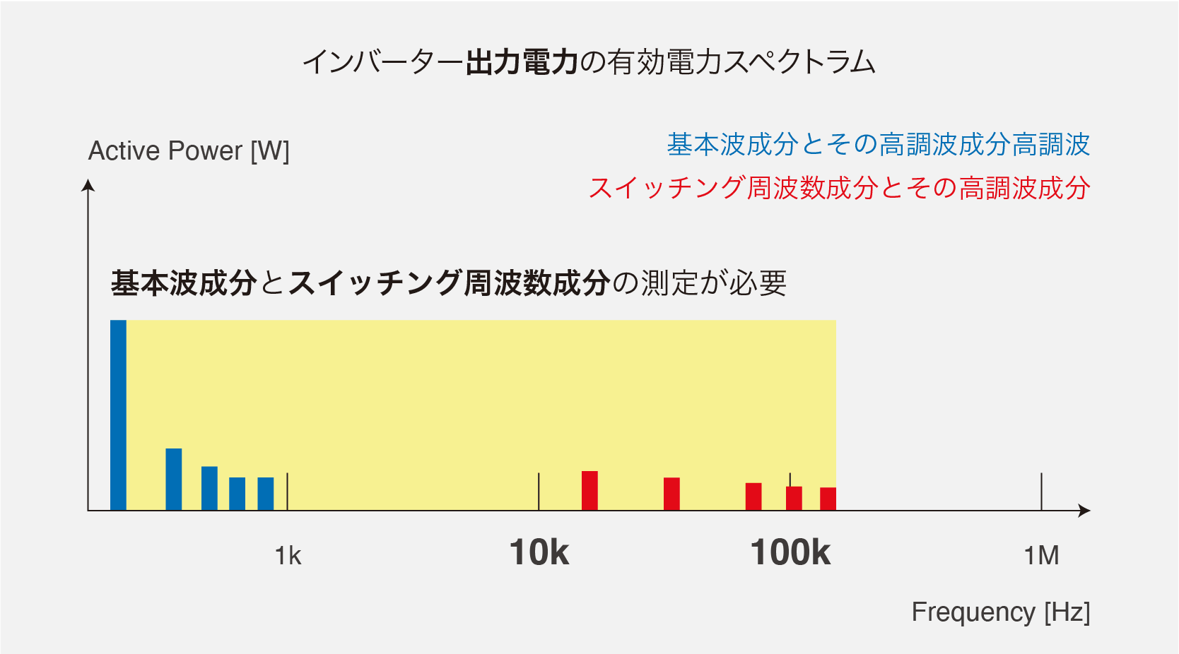 インバータ出力側の有効電力は基本波成分だけでなく、スイッチング周波数成分を含みます。高精度な効率測定のためには基本波成分だけでなくスイッチング周波数成分の正確な測定が不可欠です。