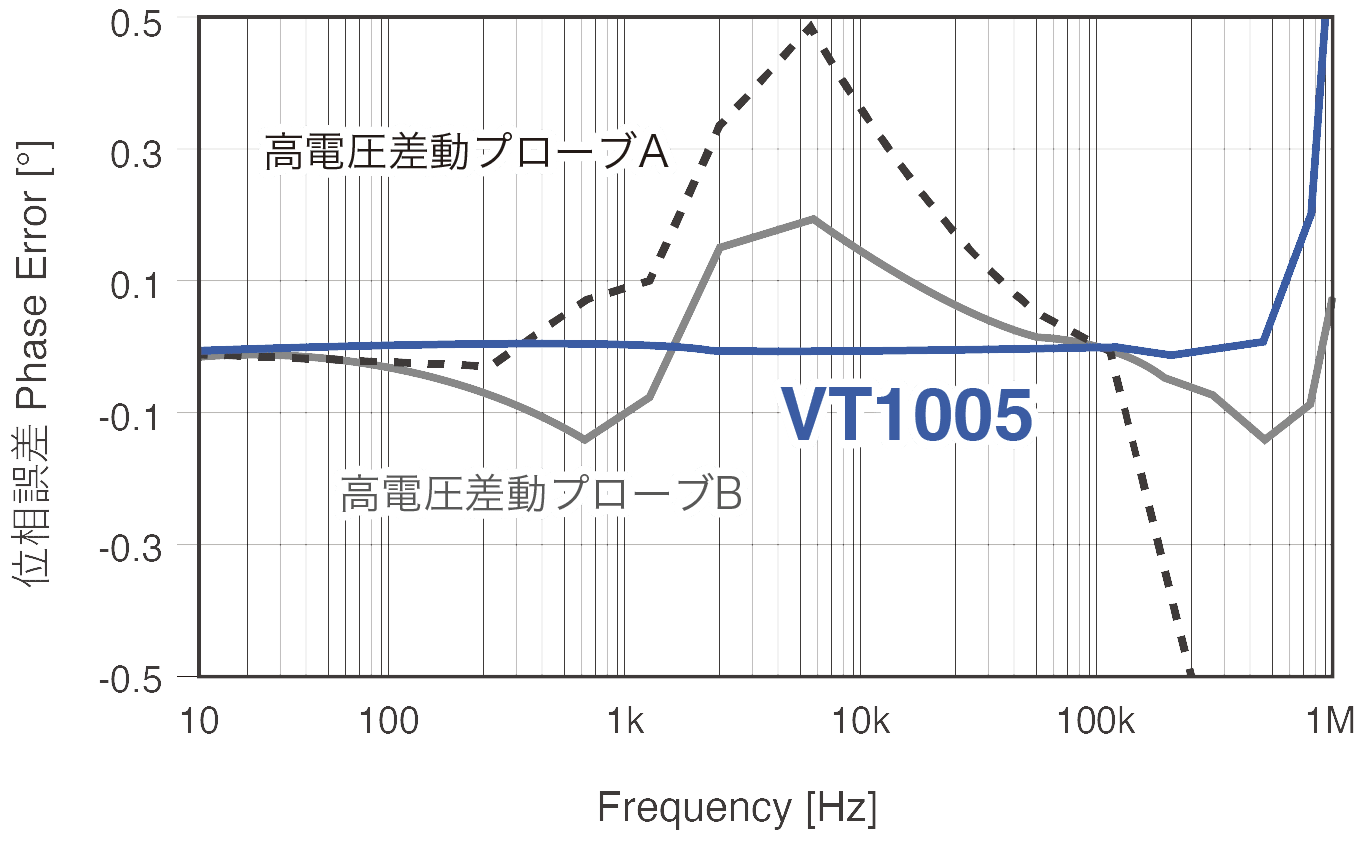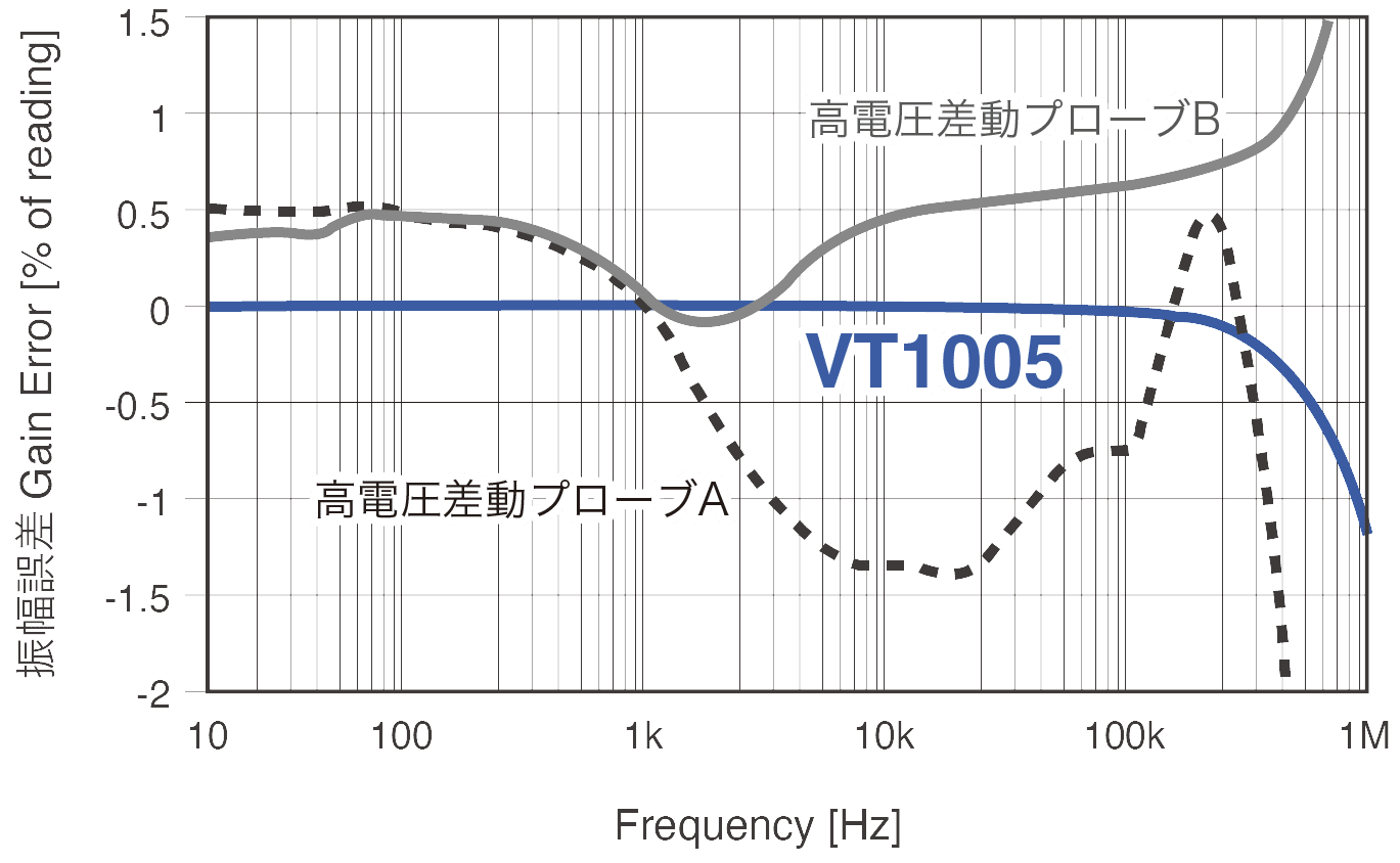 高電圧差動プローブは広帯域ですが、帯域内で数%の測定誤差が生じます。VT1005は、高確度であることに加え、帯域内で優れた周波数平坦性を持ち、従来不可能だった0.1%オーダーの効率改善効果の把握を可能にします。