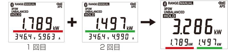 単相電力測定を2回行うと自動で足し算し、三相3線の不平衡電力が測れます。