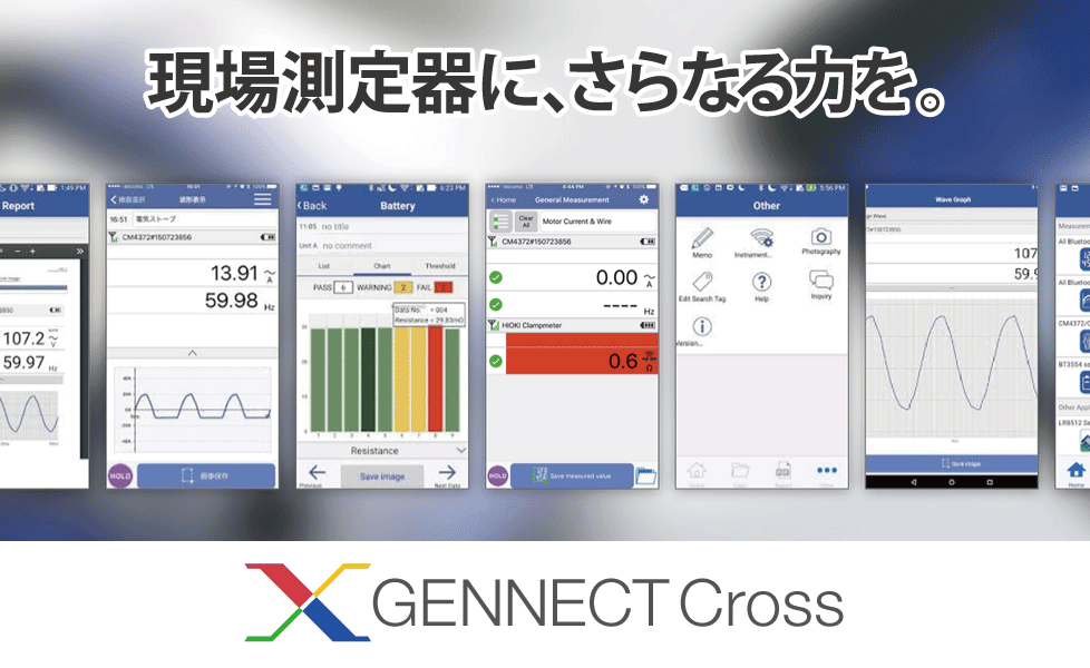 GENNECT CrossはiOSとAndroid用の無償アプリです。測定器がスマホやタブレットにBluetooth®通信で接続し、現場で役立つ新しい機能が満載されています。