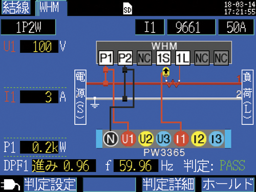 電力量計の新設・取替工事後などの結線確認に有効な機能です。結線チェック機能で培ったノウハウを活かして、電圧の大きさ、電流の大きさ、位相などの情報をもとに「PASS」、「FAIL」を判定します。