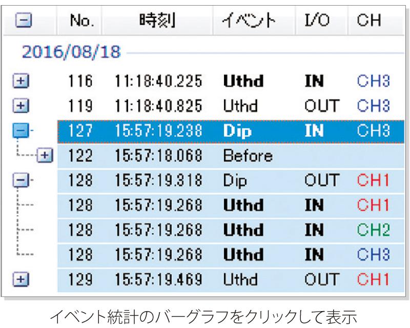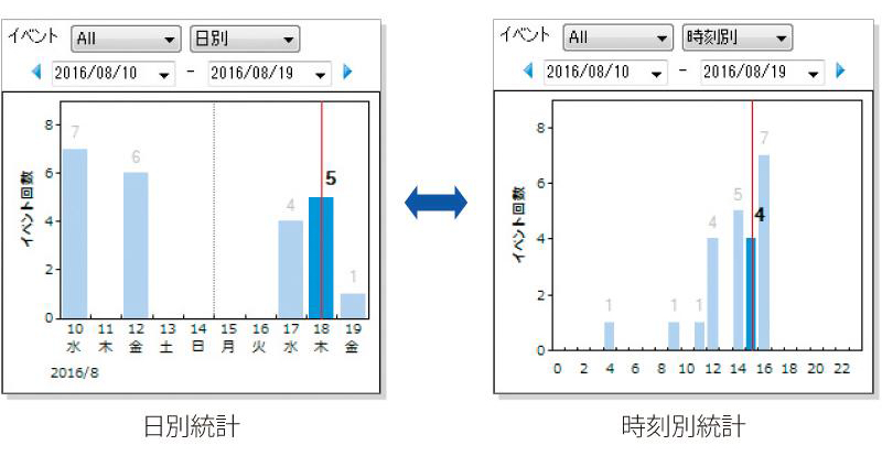 イベントの発生状況を日別または時刻別に統計表示します。決まった時間帯や曜日に発生する電源異常を容易に発見できます。