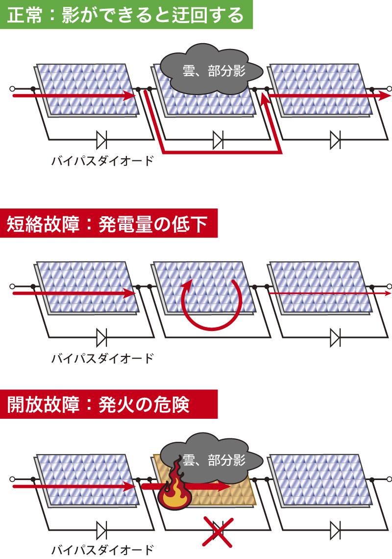 開放故障していると、影ができた時強引に不具合セルに電流を流すため発熱し、火災を引き起こす危険性があります。