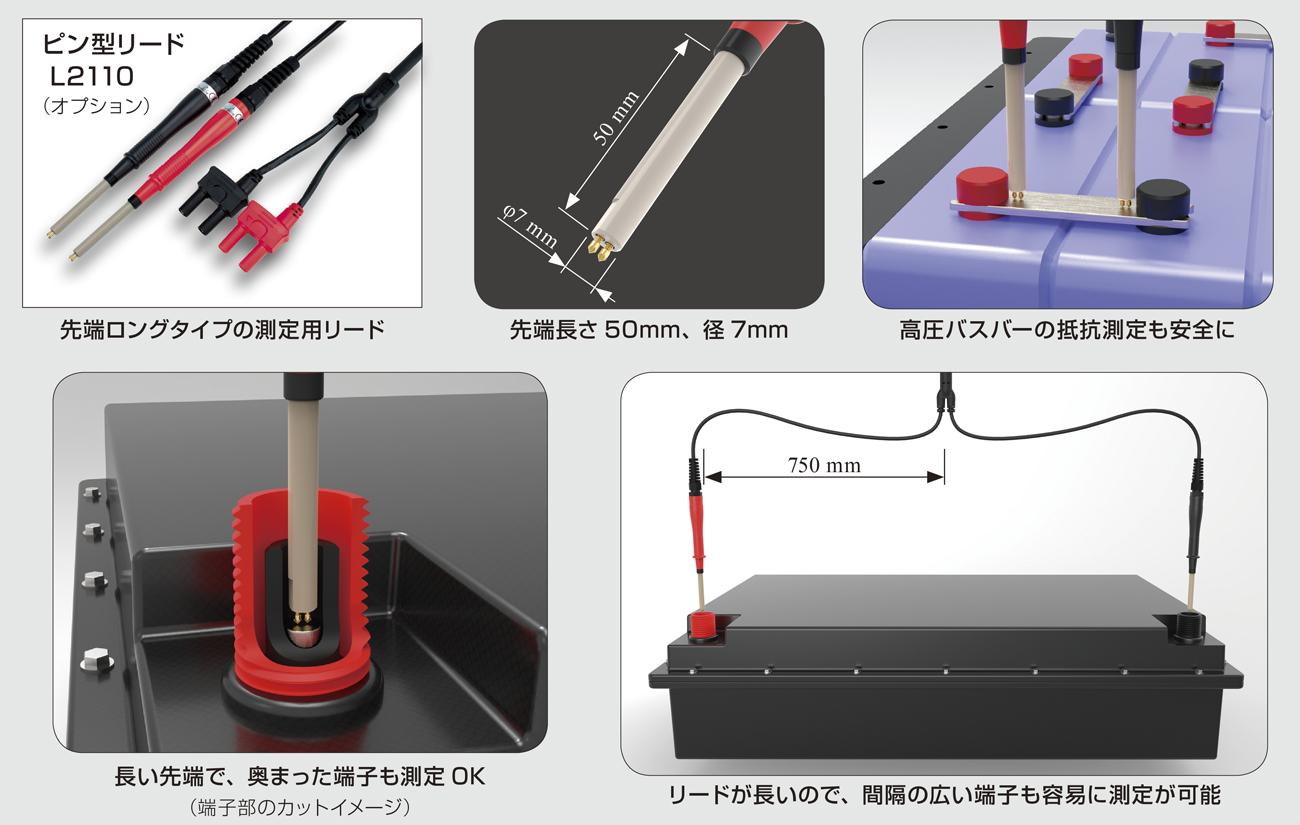 オプションの1000V対応プローブ「L2110」を使えば、高圧電池パックの広い端子間や奥まった電極、露出したバスバーなども安全且つ快適に測定できます。