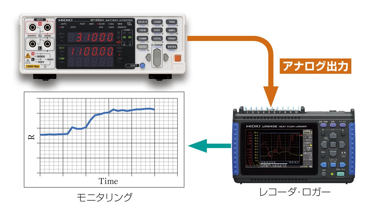 抵抗測定値のアナログ出力機能を搭載。レコーダやロガーと組み合わせることで、総抵抗値の長時間モニタリングが可能になります。
