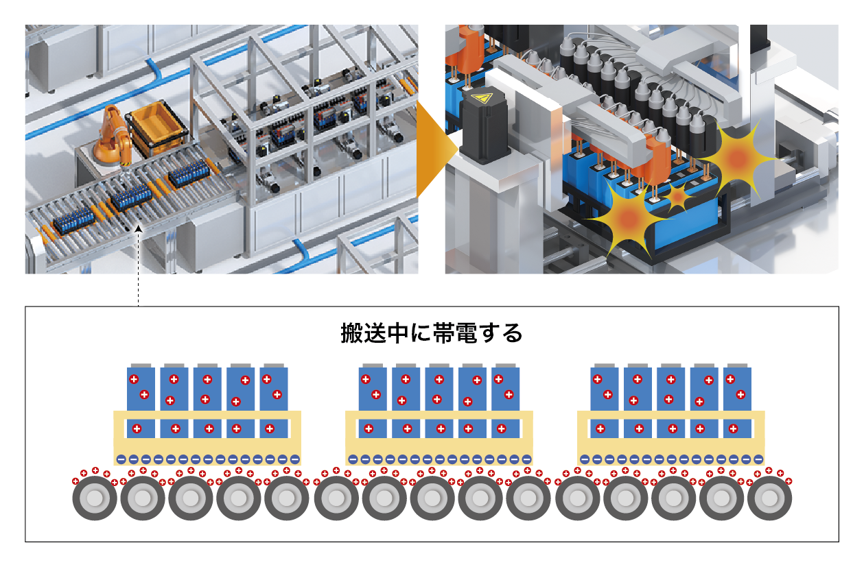生産ラインでは、コンベアでの搬送中などに電池が帯電します。