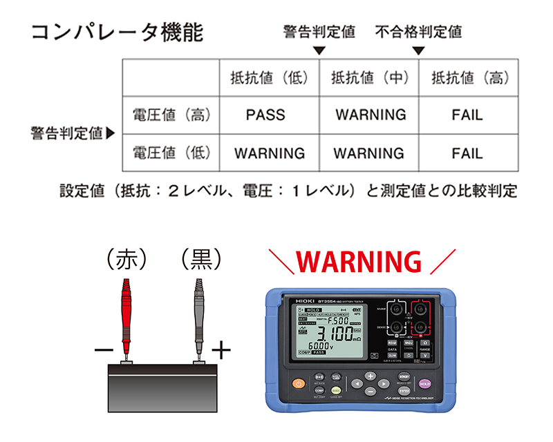 鉛蓄電池、ニッケルカドミウム、ニッケル水素などのバッテリの内部抵抗、電圧を同時に測定、コンパレータ機能を使用することにより、設定した「しきい値」から比較判定できます。しきい値には、抵抗警告判定値、抵抗不合格値、あよび電圧警告判定値があります。