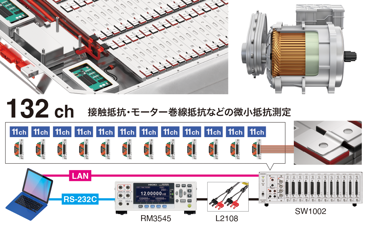 抵抗計RM3545はマルチプレクサ対応により、ネットワーク抵抗・モータ巻線・ワイヤーハーネスなど多点測定に便利な抵抗計です。ローパワー抵抗測定も搭載し、チップインダクタや信号接点の接触抵抗測定もできます。外部制御端子とコンパレータ機能で検査設備の自動化の要望に応える機能満載です。