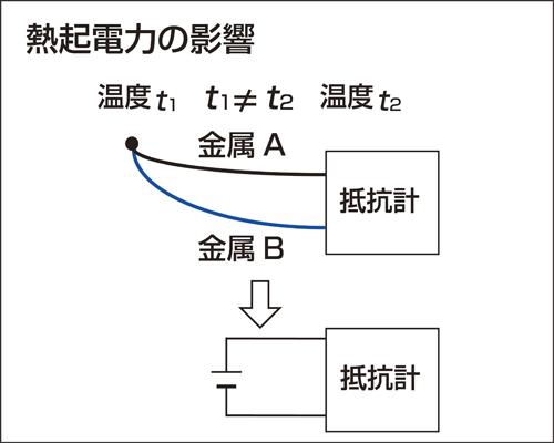 熱起電力とは、異種金属の接続部分に生じる電位差のことです(図)。具体的には測定プローブと測定対象が接触する部分、測定器と測定リードの接続部分に生じます。熱起電力の大きさは測定環境の温度によっても異なり、温度差が大きいほど熱起電力は大きくなります。RM3543は測定電流を正負の両方に流し、それぞれの検出電圧を用いて、熱起電力の影響を除去するオフセット電圧補正機能を搭載しています。
