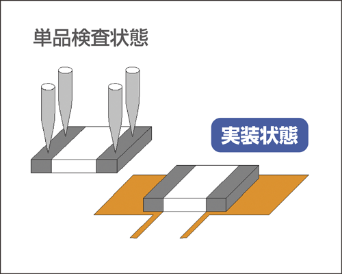 スケーリング機能により、基板実相時と単品で検査時の抵抗値の差異(プロービング位置の影響など)を補正することができます。シャントなど低抵抗の電流検出抵抗の検査に威力を発揮します。