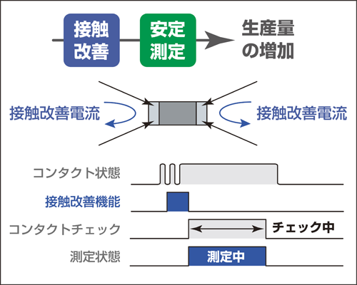 測定試料へのコンタクト時にプローブと試料間の酸化皮膜や汚れを突き破り、接触改善します。接触不良の改善で安定した測定、そしてコンタクトエラー率が低減され、生産性の向上につながります。