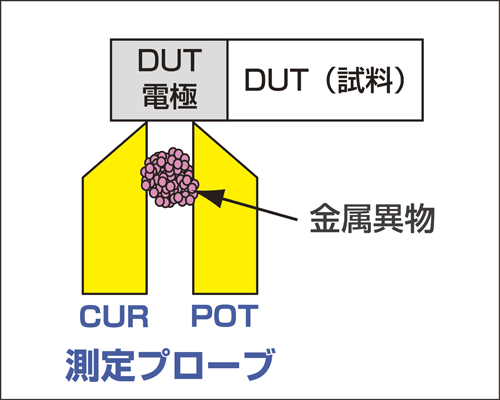 測定プローブのPOT-CUR間に金属異物があると、確実な4端子接続を維持できなくなります。非測定時にPOT-CUR間の抵抗値を測定し、プローブの短絡異常をチェックします。