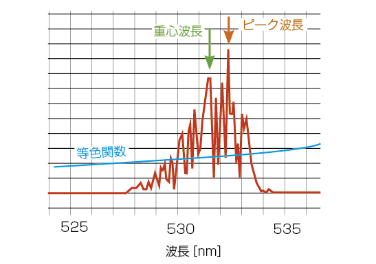 400 nmから700 nmの可視光の波長域に対して、レーザ光は非常に幅の狭いスペクトルを持っています。しかし単色レーザの波長域だけを測定すると複雑なスペクトルになっていることが多く、最大ピーク波長と正確な色度の算出に必要な重心波長に違いがあることがわかります。特にレーザ光は温度によるスペクトルの変動も大きいため、光スペクトラムアナライザのような高確度の測定だけでなく、変動に追従した重心波長の測定が要求されます。