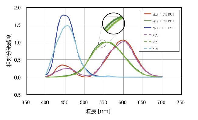 三刺激値方式の色彩計などの一般的な測色計は光学フィルタの組合せにより等色関数との近似を行っています。しかし、光学フィルタ(物理フィルタ)による等色関数への近似には限界があります。