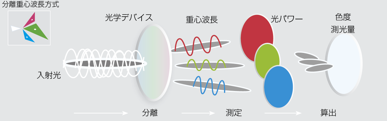 TM6104は測色に必要な物理量(重心波長、光パワー)を測定し、色度、測光量といった光学特性は等色関数を使った理論計算により算出します。