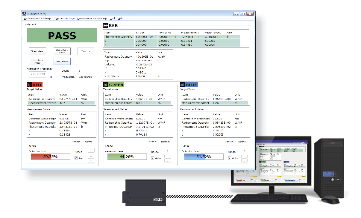 また付属の測定値モニタ用のアプリケーションRGBLaserUtilityをお使いいただけば、ホワイトバランス補助機能など標準的な測定が可能です。