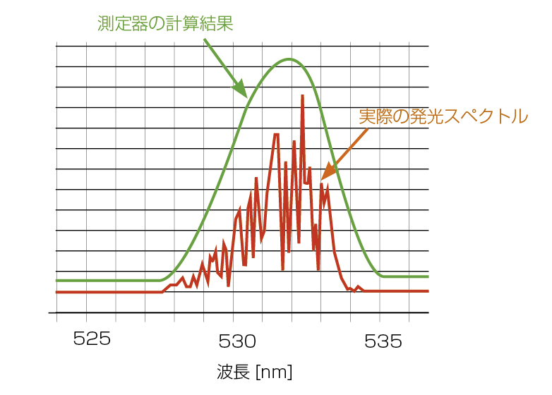 広色域テレビのホワイトバランスのように、出荷調整でΔxy = 0.001レベルまで正確に追い込むには、波長の測定能力が重要になってきます。スペクトル幅が数nmのレーザの場合は測定器のスペクトル波長幅が不足すると正しい重心波長を算出することができず、色度に影響を及ぼします。