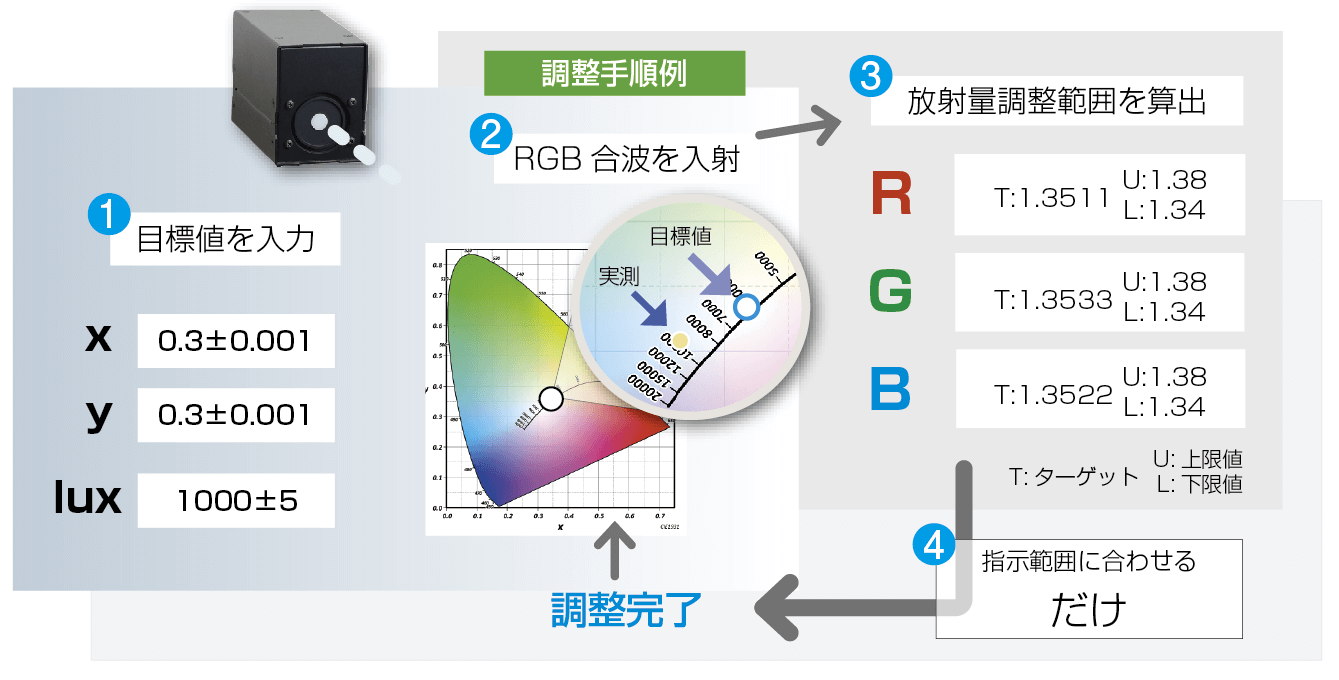 RGB合波の測定だけでRGB各光源の最適放射量を算出するので、作業工程(単色測定不要)も調整工数(手戻り無し)も半減します。