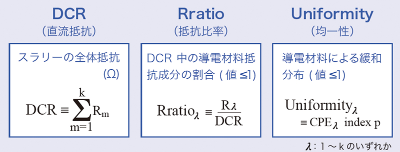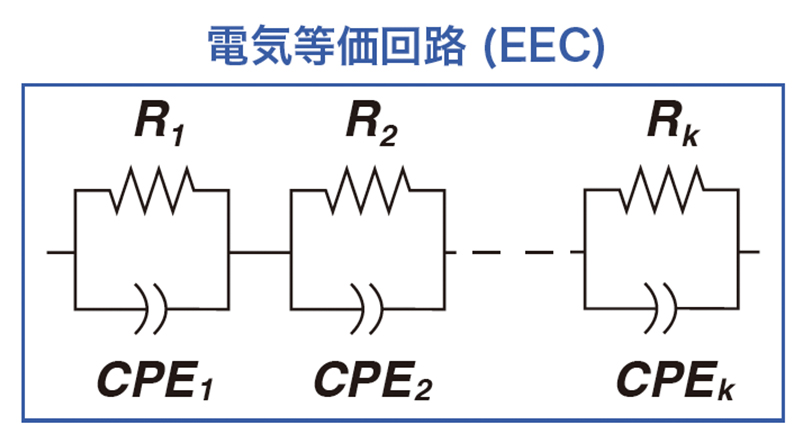 解析 | 解析方式:インピーダンスデータの等価回路解析 演算指標:DCR, 各緩和のRratio, 各緩和のUniformity |