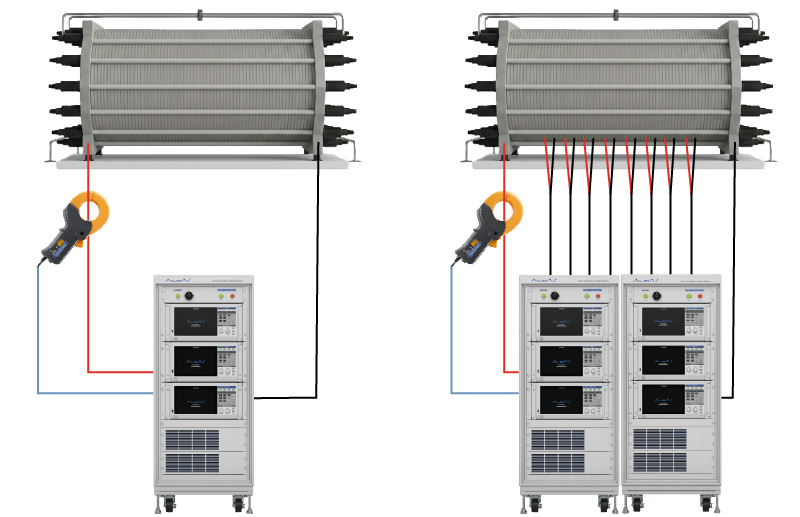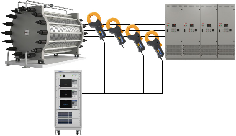 大型電解槽のように、整流器からスタックに大電流が流れる多条配線でも、複数の電流センサーを組み合わせることで、数千Aから最大で10,000 Aの電流を測定。
