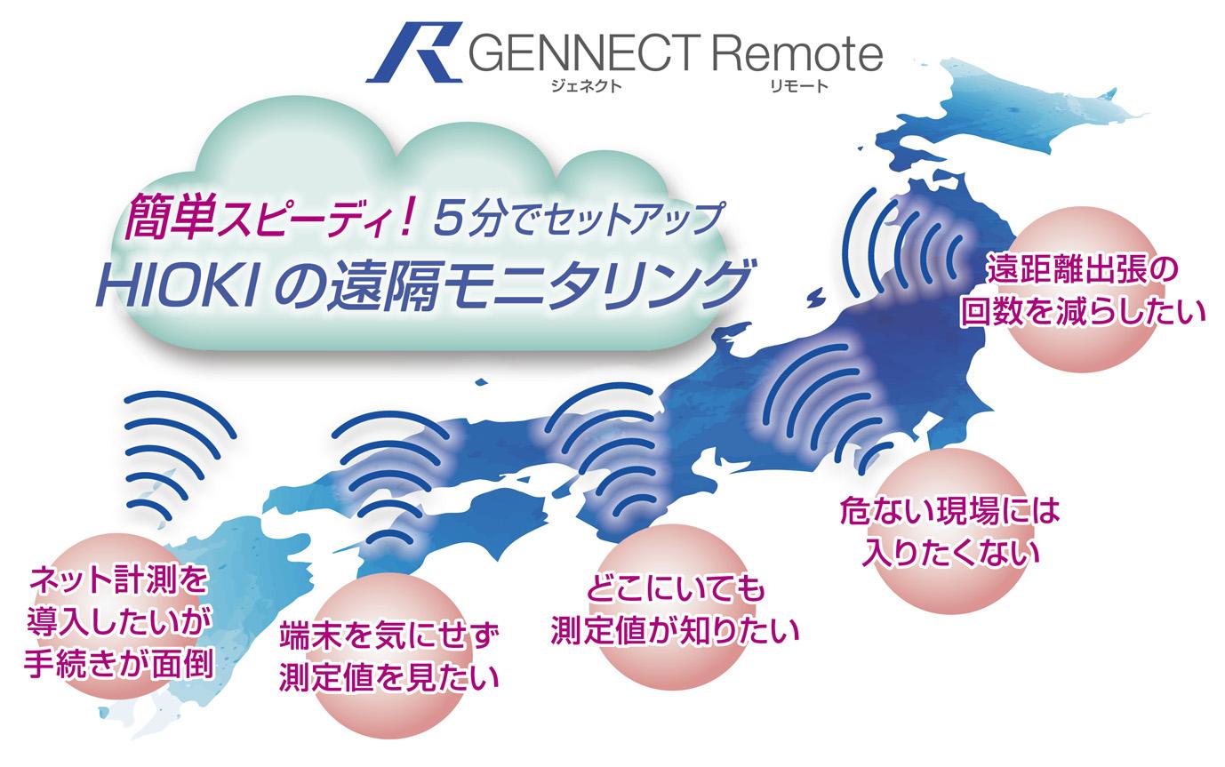 そんな要望に応えるSF4102 ジェネクトリモートプロ(GENNECT Remote Pro)は、携帯通信回線を使った遠隔監視を簡単に始められるサービスです。HIOKIの測定器および各種センサと組合せることで、電圧・電流・電力監視はもちろん、照度・回転数・磁界・振動・流量・歪などのさまざまな物理量による監視・予防保全が可能になります。