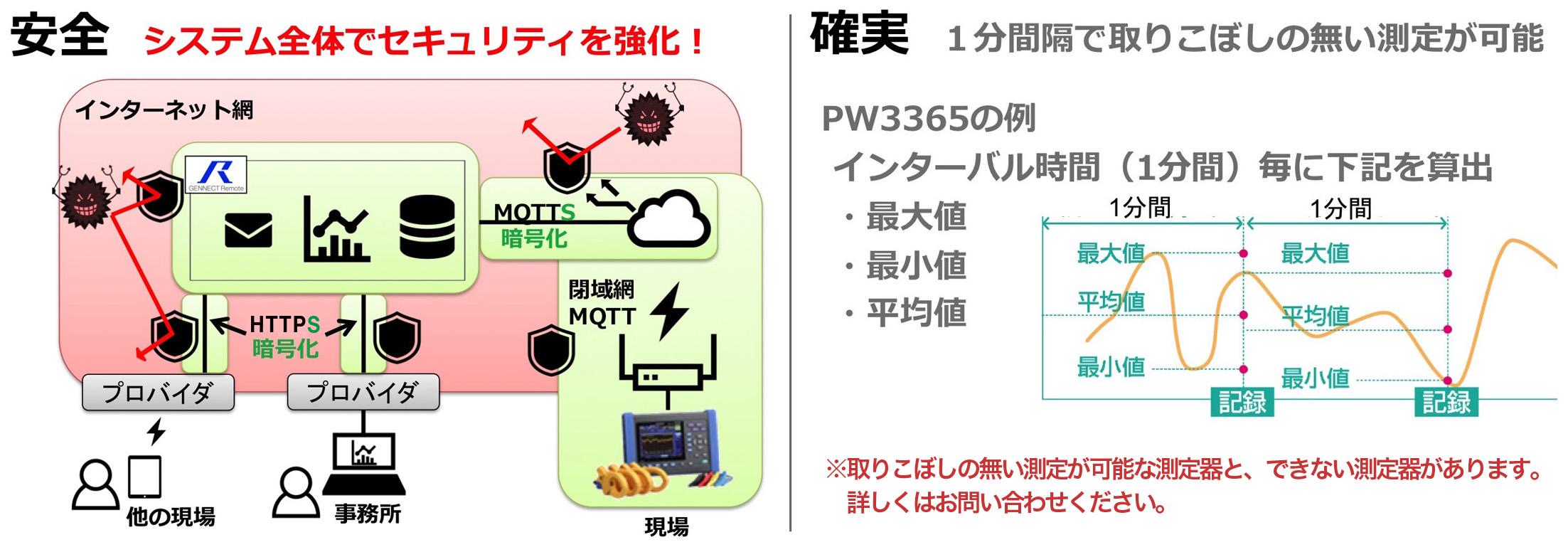 クラウドに1分に1回アップロードされるデータは、弊社計測器と組合せることで取りこぼしの無い測定が可能です。例えばPW3360電力計では、0.2秒ごとに演算された測定値(1分間に300回)のデータの中から、最大値、最小値、平均値をアップロードすることができるので、瞬間的な停電も見逃しません。