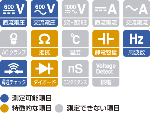 | ダイオードテスト | 開放電圧: 2.5 V以下, 測定電流: 0.5 mA, 順方向しきい値: 0.15V〜1.5V |
