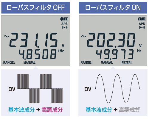 ローパスフィルタ機能を使用すれば、高調波成分をカットし、基本波だけを正確に測定する事ができます。