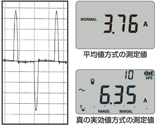 デジタルマルチメータの測定方式には、平均値方式と真の実効値方式の2つがあります。