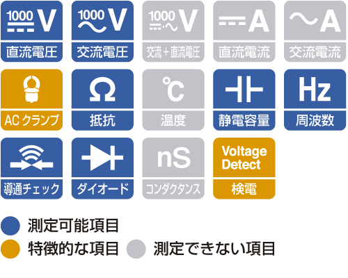 検電(50/60Hz) | Hi: AC40 V〜600 V, Lo: AC80 V〜600 V | |||||