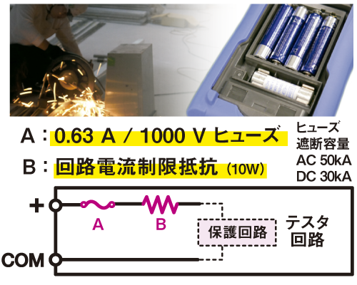 万が一テスタ内部で短絡事故が起こった場合でも限流抵抗で短絡電流を抑制し即断型ヒューズで素早く確実に回路を遮断し短絡事故を防ぎます。