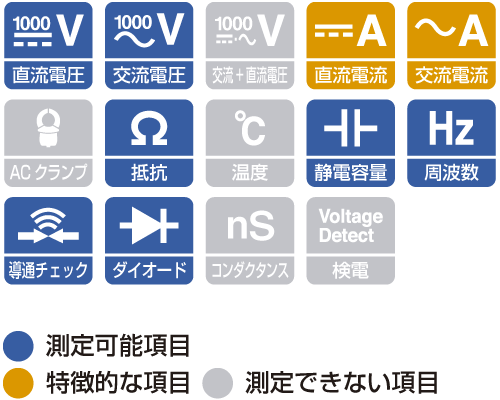 - DC V基本確度±0.3%、AC Vのf特40 Hz〜1 kHz