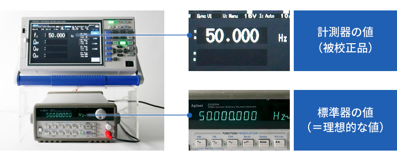 校正は計測器の状態を確認することで、計測器の健康診断のようなものです。 具体的には、標準器が示す理想的な値とお持ちの計測器が示す値を比較し、その時の計測器の状態を確認します。
