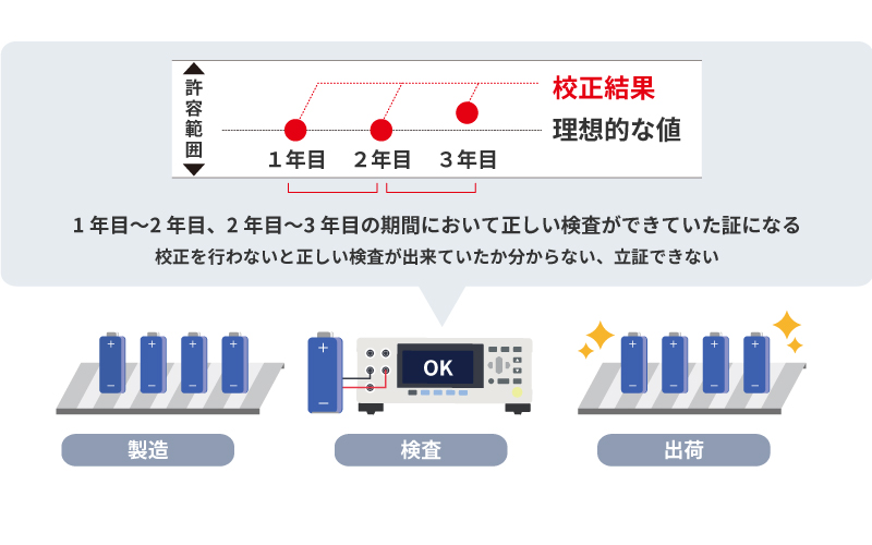 計測器はどんなに高品質なものでも、環境や使い方によって測定値は理想的な値に対して差が生じてしまいます。校正を行うことでその差を把握し、必要に応じて調整や修理を行うことが出来ます。校正を行わずに使用を続けると、許容範囲から外れた測定値をご使用になるおそれがあります。校正を定期的に行い、校正値を確認することで、正しい検査ができていたことの証拠になります。