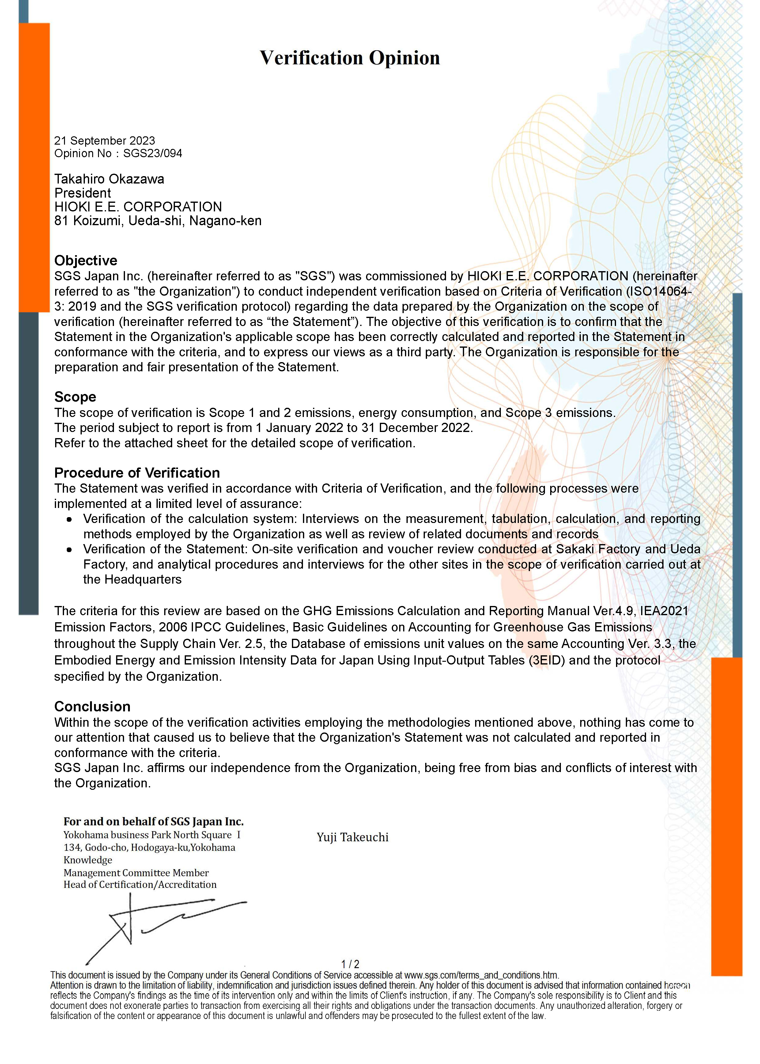 Hioki Receives Third-party Verification Opinion Concerning Its Greenhouse Gas Emissions