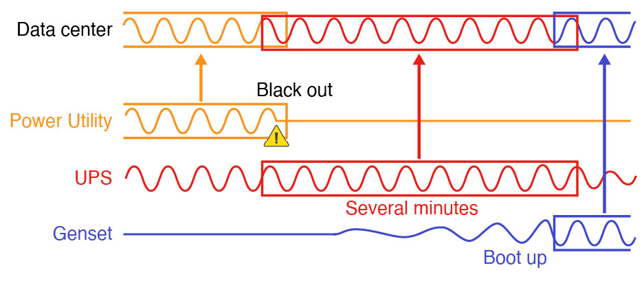 Schematic Diagram of Power Backup: When the utility line loses power, the UPS provides several minutes of backup time, during which the generator starts up. As a result, the data center experiences no downtime