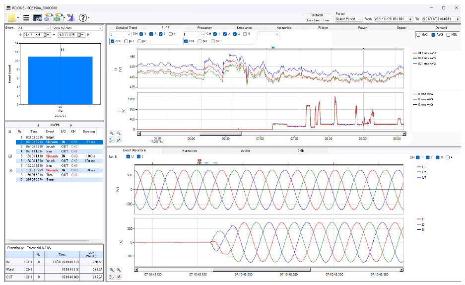 Example of load variation test with PQ3198: The voltage maintains a stable value regardless of load current fluctuations