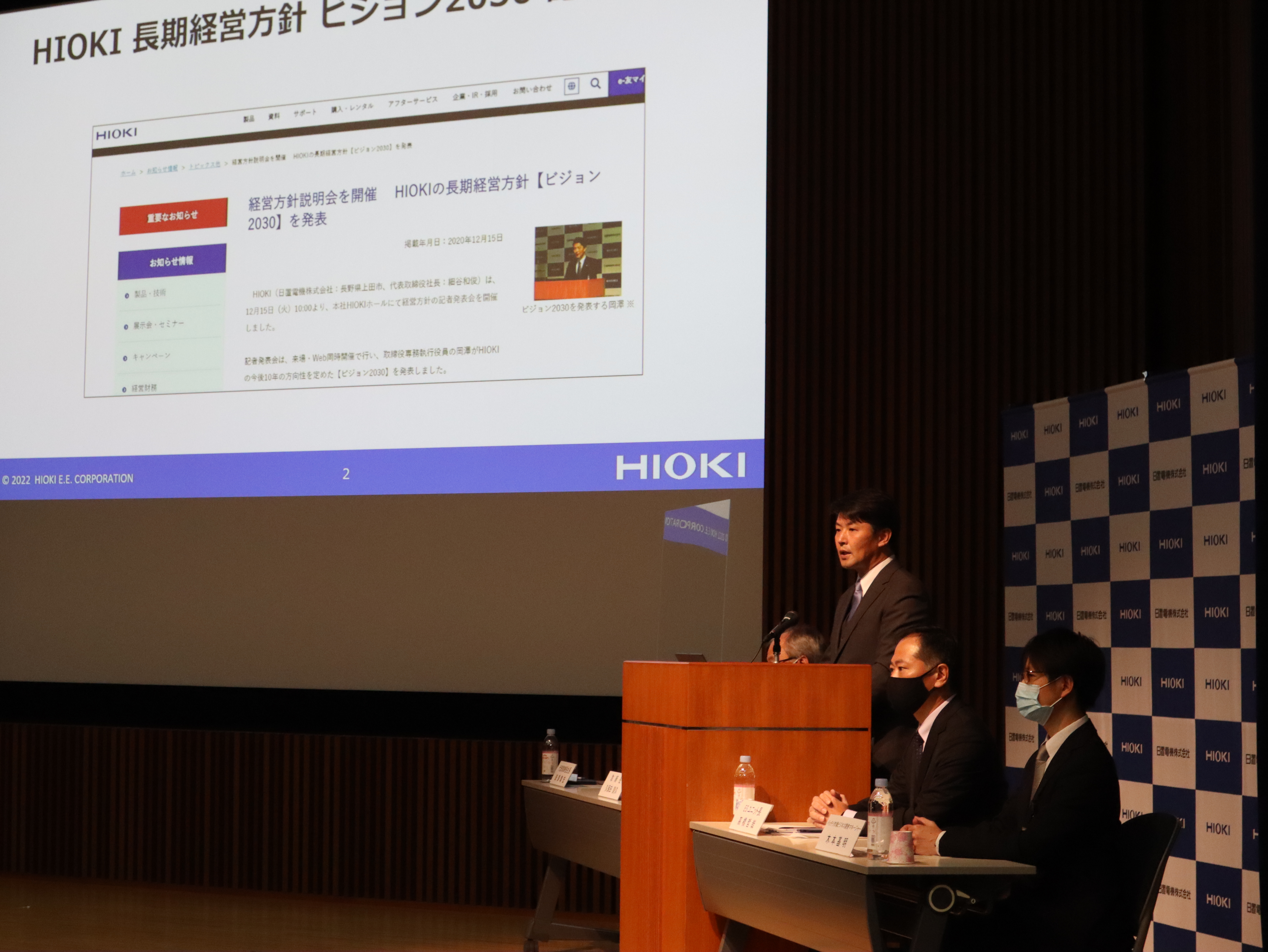 At the event, which accommodated both in-person and online attendees, President Takahiro Okazawa described the initiatives and direction of Hioki’s efforts to contribute to the battery lifecycle as a leading company in the area of battery measurement. He also described the results of specific initiatives targeting each stage of the battery life cycle, future plans, and the company’s strengths in the field of battery measurement, among other topics. Executives and managers of various departments answered attendees’ questions in an effort to deepen their understanding of Hioki’s efforts to help realize a circular economy for batteries.